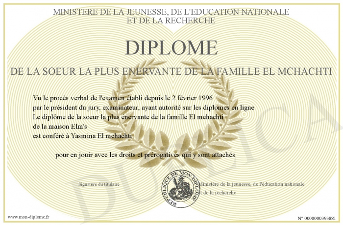 Envoyez par email votre Diplôme de la soeur la plus énervante de la famille El mchachti personalisé