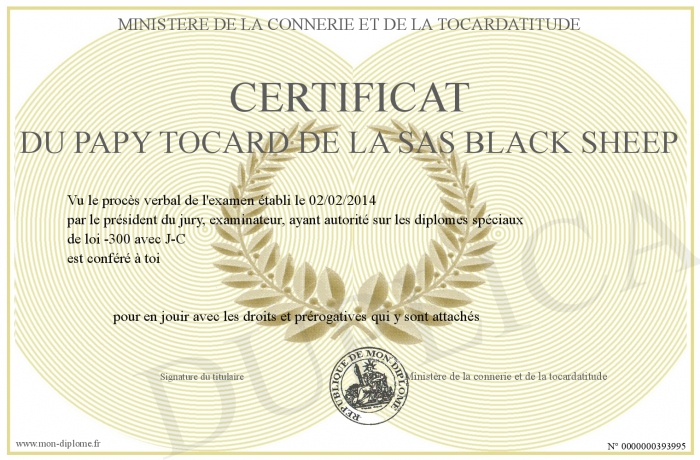 Envoyez par email votre certificat du papy tocard de la SAS black Sheep personalisé