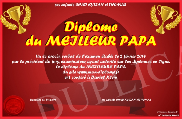 Envoyez par email votre Diplôme du MEILLEUR PAPA personalisé