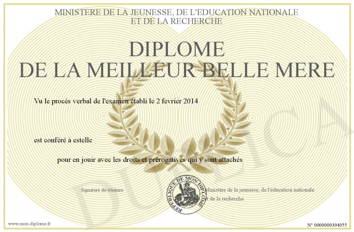 Envoyez par email votre Diplôme de la meilleur Belle Mere personalisé