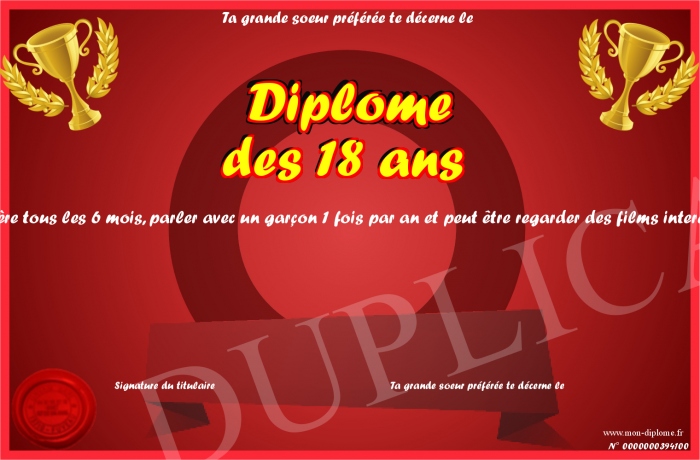 Envoyez par email votre Diplôme des 18 ans personalisé
