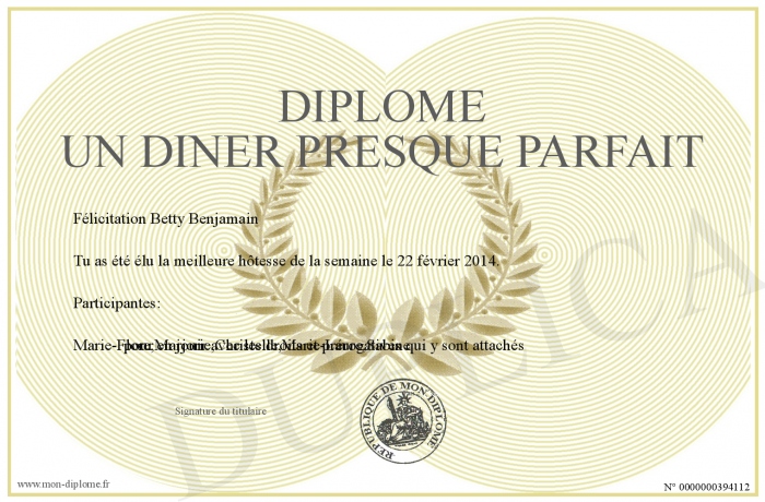 Envoyez par email votre DIPLOME UN DINER PRESQUE PARFAIT personalisé