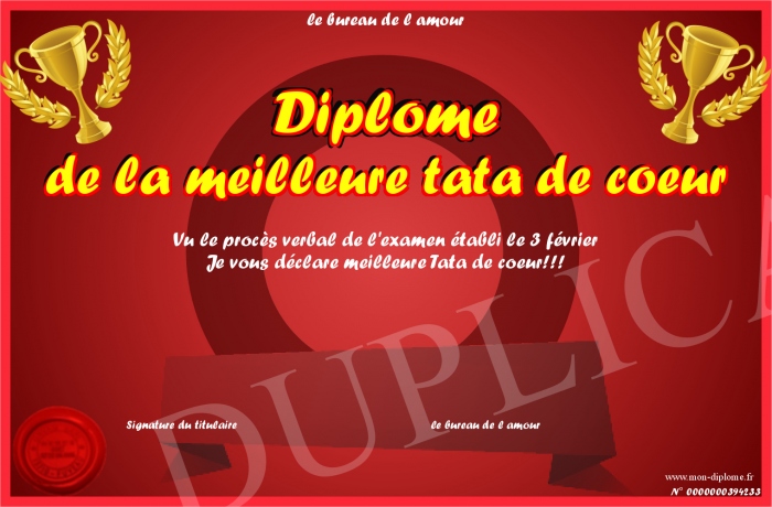 Envoyez par email votre Diplôme de la meilleure tata de coeur personalisé