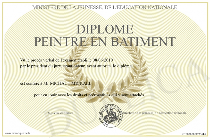 Envoyez par email votre Diplôme peintre en batiment personalisé