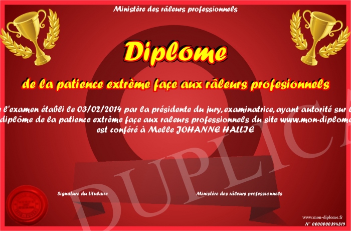 Envoyez par email votre Diplôme de la patience extrème façe aux râleurs profesionnels personalisé