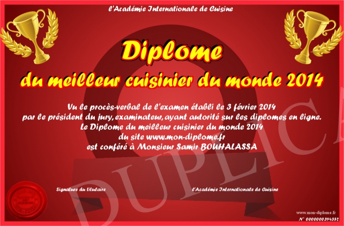Envoyez par email votre Diplôme du meilleur cuisinier du monde 2014 personalisé