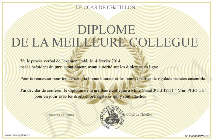 Envoyez par email votre Diplôme de la meilleure collègue personalisé
