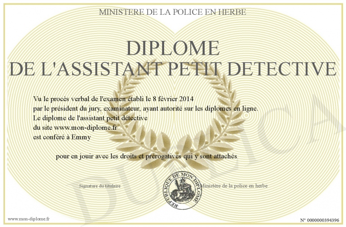 Envoyez par email votre diplôme de l'assistant petit détective personalisé