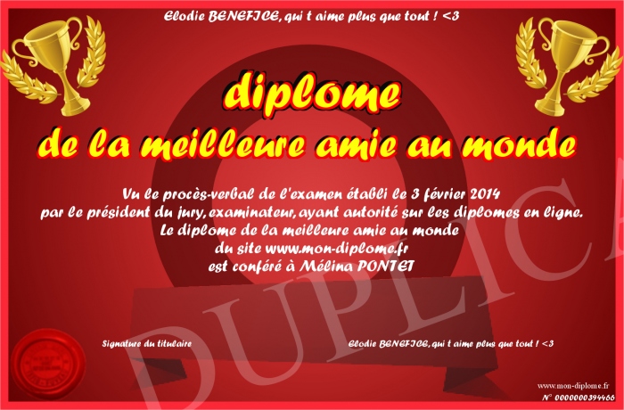 Envoyez par email votre diplôme de la meilleure amie au monde personalisé