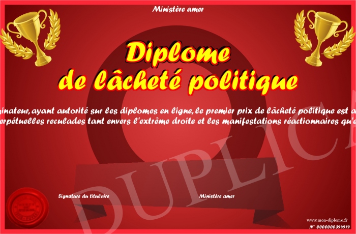 Envoyez par email votre Diplôme de lâcheté politique personalisé
