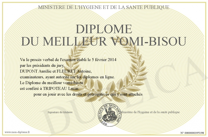 Envoyez par email votre Diplôme du meilleur vomi-bisou personalisé