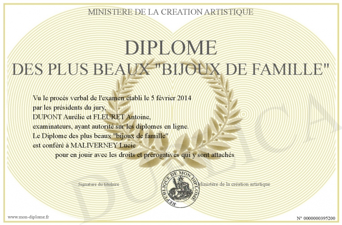 Envoyez par email votre Diplôme des plus beaux -bijoux de famille- personalisé