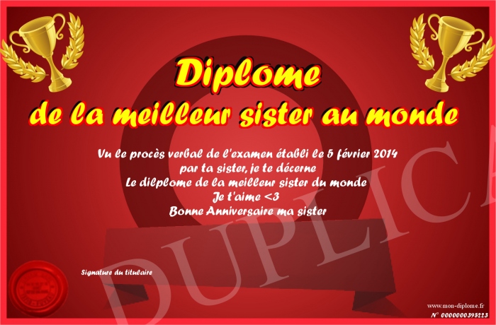 Envoyez par email votre Diplôme de la meilleur sister au monde personalisé