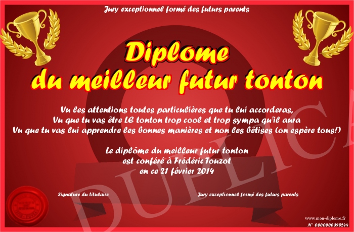 Envoyez par email votre Diplôme du meilleur futur tonton personalisé