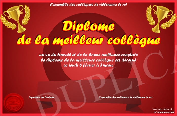Envoyez par email votre Diplôme de la meilleur collègue personalisé