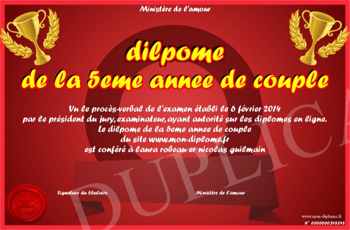 Envoyez par email votre dilpome de la 5eme annee de couple personalisé