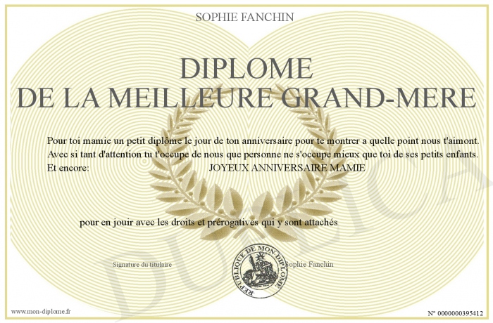 Envoyez par email votre Diplôme de la meilleure Grand-mère personalisé