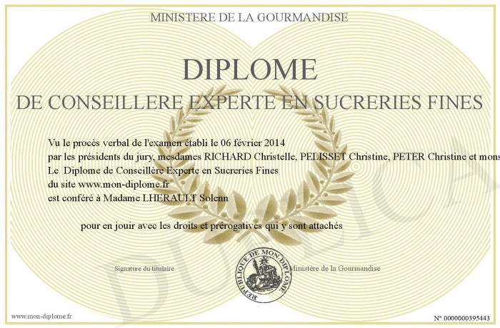 Envoyez par email votre Diplome de Conseillère Experte en Sucreries Fines personalisé