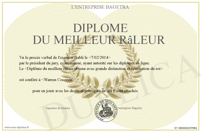 Envoyez par email votre Diplôme du meilleur râleur personalisé