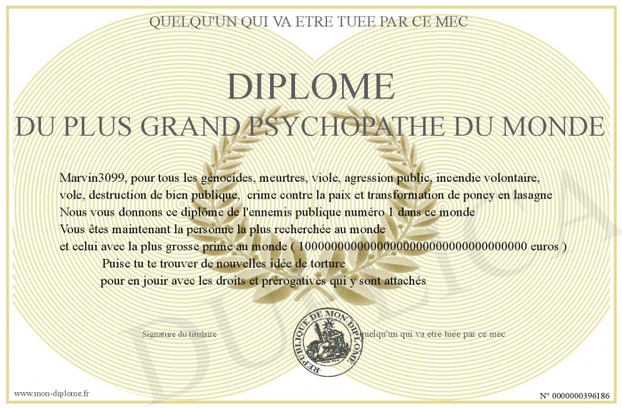 Envoyez par email votre Diplôme du plus grand psychopathe du monde personalisé