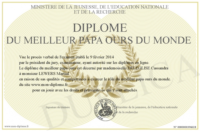 Envoyez par email votre Diplôme du meilleur papa ours du monde personalisé
