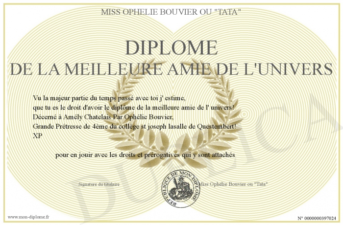 Envoyez par email votre Diplôme de la meilleure amie de l'univers personalisé