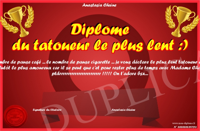 Envoyez par email votre Diplôme du tatoueur le plus lent :) personalisé