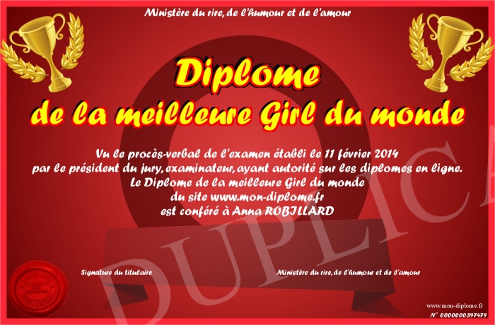Envoyez par email votre Diplome de la meilleure Girl du monde personalisé