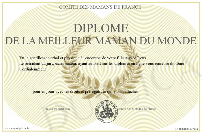 Envoyez par email votre Diplôme de la meilleur Maman du Monde personalisé