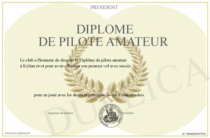 Envoyez par email votre Diplome de pilote amateur personalisé