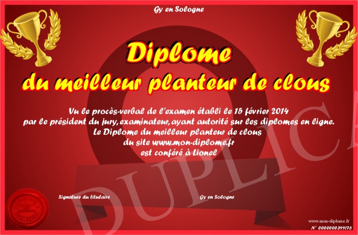Envoyez par email votre Diplôme du meilleur planteur de clous personalisé
