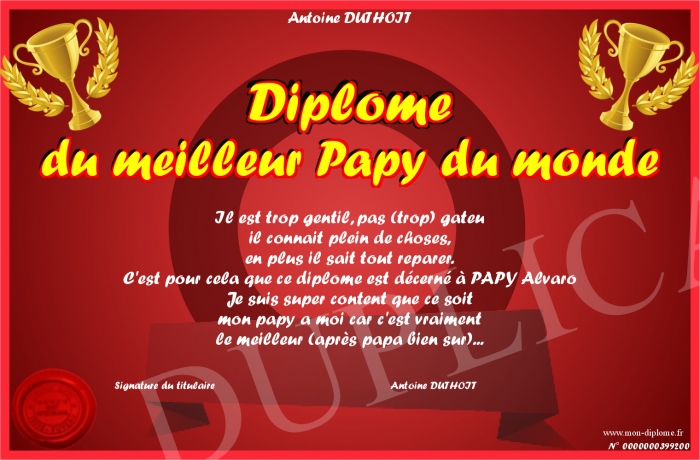 Envoyez par email votre Diplôme du meilleur Papy du monde personalisé