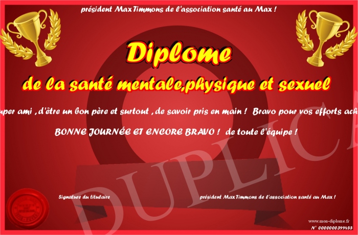 Envoyez par email votre Diplôme de la santé mentale,physique et sexuel personalisé