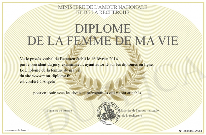 Envoyez par email votre Diplôme de la femme de ma vie personalisé