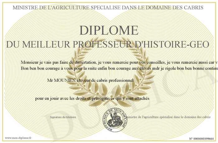 Envoyez par email votre Diplôme du meilleur professeur d'histoire-géo personalisé