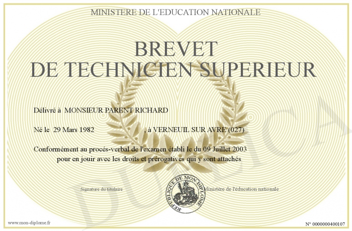 Envoyez par email votre Brevet de Technicien Supérieur personalisé