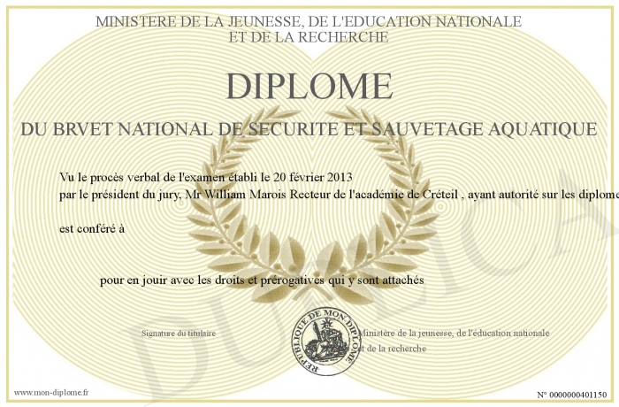 Envoyez par email votre Diplôme du Brvet National de Sécurité et Sauvetage Aquatique personalisé