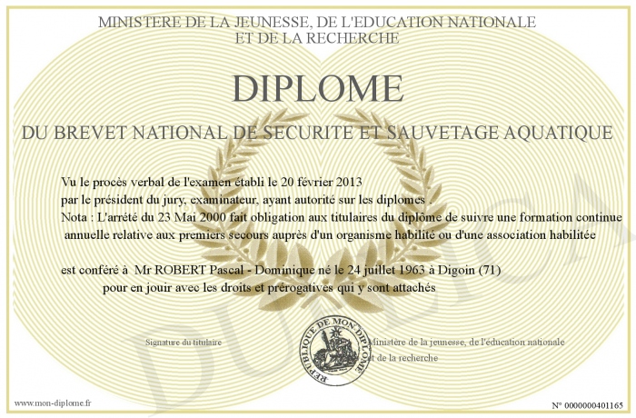 Envoyez par email votre Diplôme du Brevet National de Sécurité et Sauvetage Aquatique personalisé