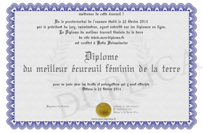 Envoyez par email votre Diplôme du meilleur écureuil féminin de la terre personalisé