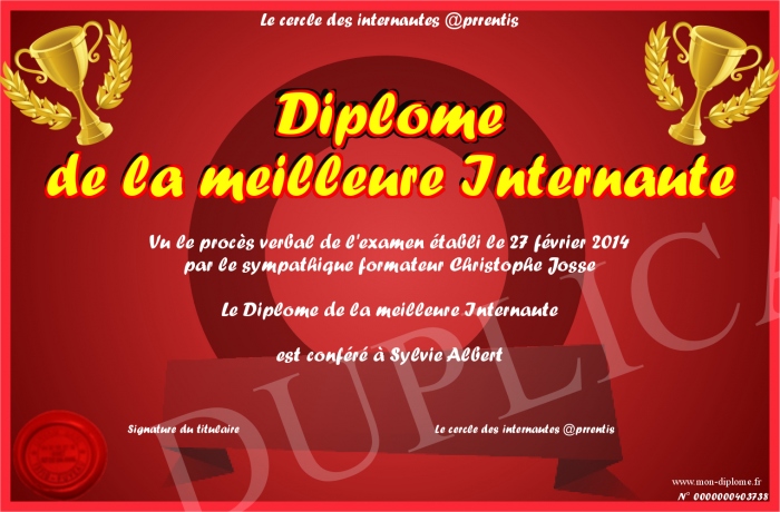 Envoyez par email votre Diplôme de la meilleure Internaute personalisé