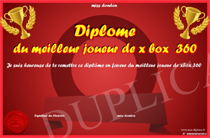 Envoyez par email votre Diplôme du meilleur joueur de x box 360 personalisé