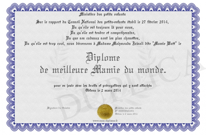 Envoyez par email votre Diplôme de meilleure Mamie du monde. personalisé