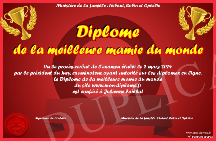 Envoyez par email votre Diplôme de la meilleure mamie du monde personalisé