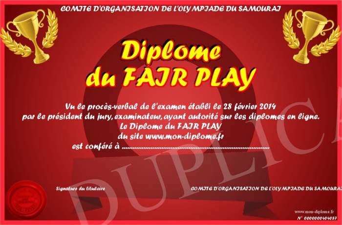 Envoyez par email votre Diplôme du FAIR PLAY personalisé