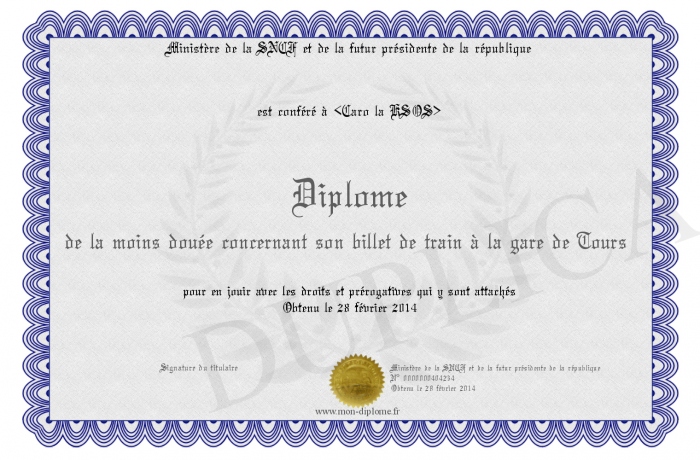 Envoyez par email votre Diplôme de la moins douée concernant son billet de train à la gare de Tours personalisé