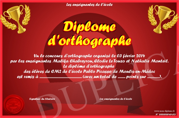 Envoyez par email votre Diplôme d'orthographe personalisé