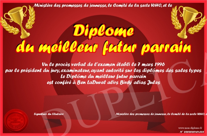 Envoyez par email votre Diplôme du meilleur futur parrain personalisé