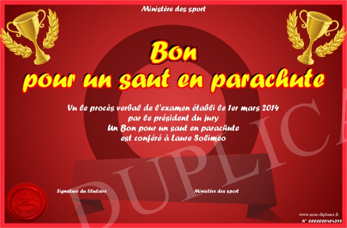 Envoyez par email votre Bon pour un saut en parachute personalisé