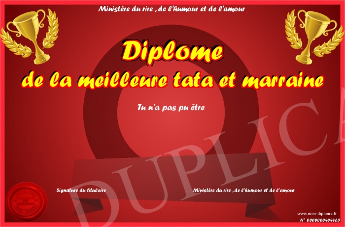 Envoyez par email votre Diplôme de la meilleure tata et marraine personalisé