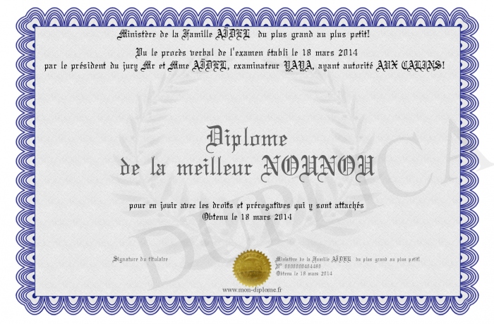Envoyez par email votre Diplôme de la meilleur NOUNOU personalisé